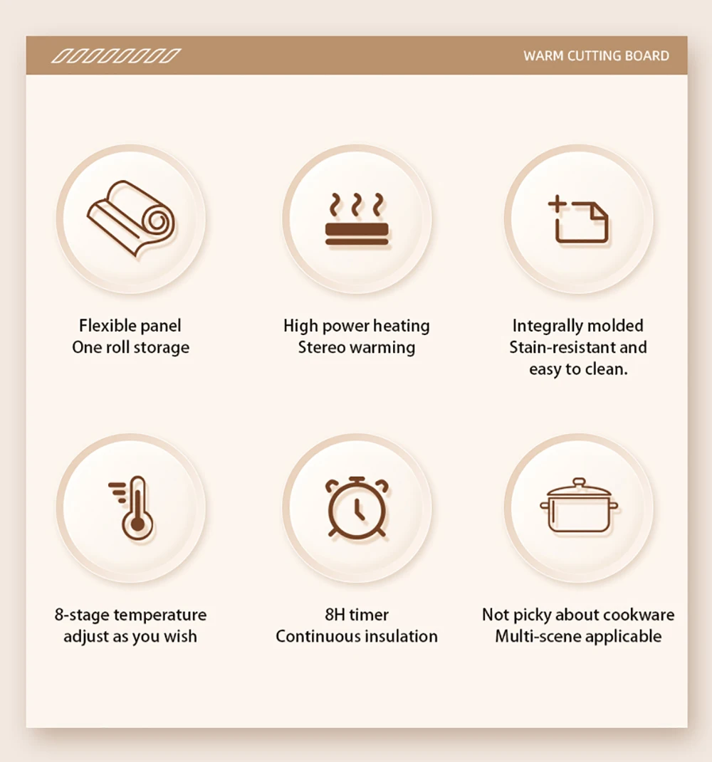 【Premium Silicone Nano-Material】Crafted from top-tier flexible silicone nano material, raugee electric warming tray offers durability, splash-proof protection, stain resistance, and oil resistance. Fold and store without worrying about unsightly creases, ensuring lasting quality.It is compatible withaterials: glass, stainless steel, iron pot, ceramic, casserole & Plastic.